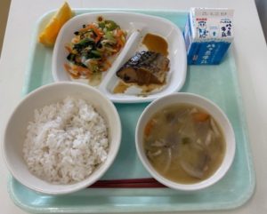 今日は給食センターでじっくり時間をかけてつくったさばの煮つけと、煮干しでだしを取ったみそ汁、かつおぶしのうま味を感じる白菜の和え物です。