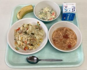 パエリア 牛乳 ポテトサラダ ソパ・デ・アホ バナナ