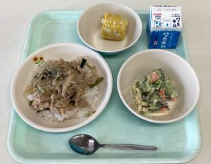 豚肉丼 牛乳 マカロニサラダ ゆでとうもろこし