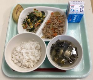 麦ごはん 牛乳 豚肉のしょうが炒め 野菜のごま和え わかめと豆腐の味噌汁 バナナ