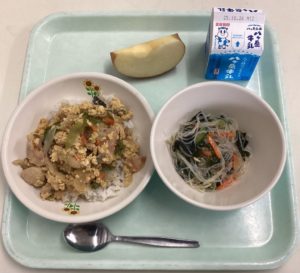 親子丼 牛乳 野菜と春雨のサラダ りんご