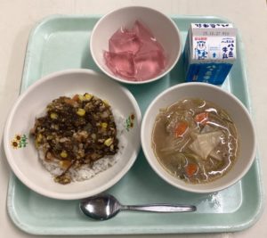 もずくにはおなかをそうじしてくれる食物(しょくもつ)せんいが多く(おお  )(ふく)まれています。()(もの)として食べる(た   )ことが多い(おお  )ですが、今日(きょう)はどんぶりにしました。ピーマン、とうもろこし、にんじんなどの野菜(やさい)入って(はい   )栄養(えいよう)たっぷりです。