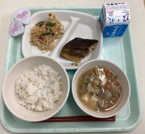 麦ごはん 牛乳 ホッケの塩焼き 切り干し大根の炒め物 豚汁 ひとくちももゼリー