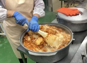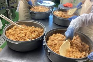 大量調理なので、具を別で炒め、炊きあがったご飯に混ぜています。白いご飯に混ぜるので、ムラがないように力を入れて混ぜています。