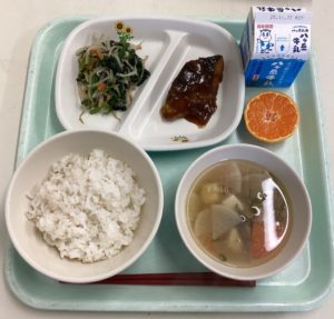 麦ごはん 牛乳 さばのみそ煮(甲州みそ使用) 野菜のごま和え のっぺい汁 みかん