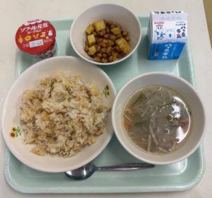キムチチャーハン 牛乳 さつまいもと大豆の揚げ煮 千切り野菜スープ ヨーグルト