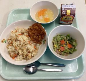 根菜ピラフ コーヒー牛乳 クリスピーチキン 星のにんじん入りサラダ きらきらフルーツゼリー