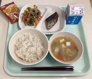 麦ご飯 牛乳 さわらのたまり醤油焼き 野菜のごま和え 豚汁 さつまいもチップス