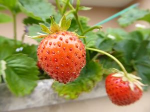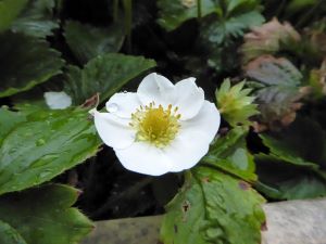 玄関横のイチゴが赤く色づいていす。イチゴはバラ科に属します。バラ科はバラの他にはサクラなどもそうです。イチゴの花は写真のような白い花です。小さい頃、道を歩きながら、ヘビイチゴやクサイチゴをとって食べました。中でも、ちょっと林の中に入って食べたモミジイチゴは絶品でした。ただ、自然の物は、危険なものもあるのでむやみに口にしないようにしてください。