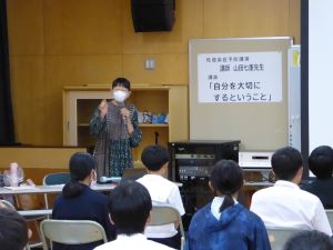 6月13日(木)2校時に山田七重先生を講師として「自分を大切にすること」という題で性感染症予防講演会を3年生とその保護者を対象に実施しました。HIVウイルスについてのお話で、エイズに対する正しい知識を知ることが出来ました。そして「自分を大切にすること」=「相手を大切にすること」などの話しは、これから大人になっていく中学生にとって非常に貴重であったと思います。