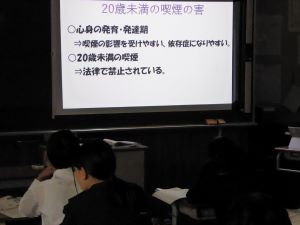 10月23日(水)も飯塚先生の2年生の保健体育の授業を参観しました。「喫煙の未成年者への悪影響という授業でした。パワーポイントを使って外国と日本の違いや昭和と令和の喫煙に対する環境の違いも示しながら、癌のリスクが高くなることや依存性の高さ、その他病気になる確率の高さなどの説明があり、わかりやすい授業でした。成長期にたばこを吸うことのリスクの高さをあらためて認識することができました