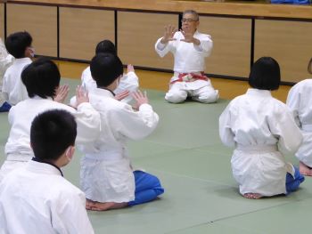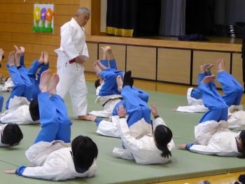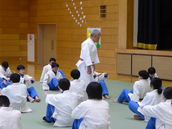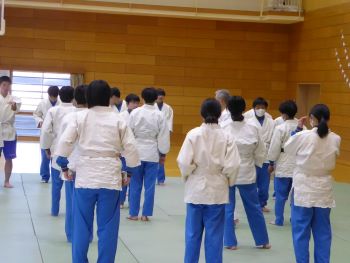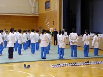 今日の1年A組の体育は、体育館で柔道の授業でした。体育館のフロアに畳を敷き専門の講師の先生から指導を受けていました。柔道着の着方、礼の仕方、受け身の方法などです。1年生は元気よく授業に取り組んでいました。