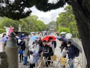 2023年5月14日 / 最終更新日時 : 2023年5月14日 武川小 ブログ 鶴ヶ丘八幡宮 班行動も無事に終わり、鶴ヶ丘八幡宮の階段に集合しました。予報通り、雨が降り出し、雨宿り。八幡宮を散策して、ホテルに向かいます。