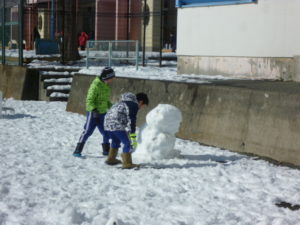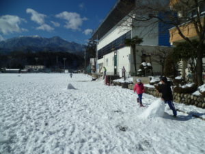 今日は、雪目になりそうな快晴となりました。朝はガチガチだった雪も、中休みには少し緩み、雪だるまづくりや雪合戦など、目いっぱい雪で遊んでいました。