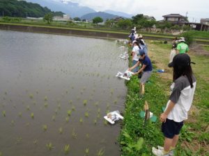 6/13(木)に行った田植えから、すくすく成長している稲ですが、雑草もどんどん成長しています。田の中に入って草取りをすることが必要なときもありますが、今日はプログラミング学習をして「アイガモロボ」を動かす体験をさせていただきました。先進的な取り組みに子どもたちもびっくりしていました。プログラミングはとても難しいようでしたが、指令したようにアイガモロボを動かすことができ、とても楽しかったようです。