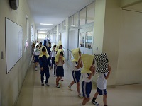 今日は、火災想定の避難訓練でした。素早く安全に校庭へ出ることができました。校長先生のお話の中で、「火事の時こわいのは火の他に何があるでしょう?」ということがありました。正解は「けむり」でした。ハンカチ等を使ったり姿勢を低くしたりするということもあらためて教わりました。