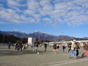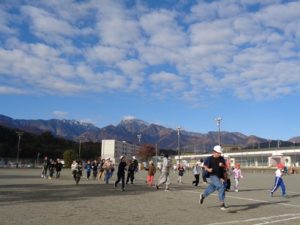 朝運動で先週から始まった全校の『ランニング』。甲斐駒ヶ岳を見ながら、今日も子どもたちは息を弾ませて走っていました。トラックの外回り(185.04m)が高学年で、内回り(159.92m)が低学年です。 「今日は6周走ったよ・・・」「最後まで歩かないで走ったよ・・・」といった声が聞こえました。担任の先生方も「ハアハア・・・」言いながら一緒に走っています・・・・・