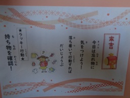 昨日、一昨日と2日間に分けて、『身体測定』と、固まった体をほぐしたり背筋を伸ばしたりする『ストレッチ講習』を行いました。昨日のブログにも出ていたように、児童もネット動画を見ながら運動をしている時代です。良いものは取り入れて、ダメなものは見ない取捨選択をしっかりして活用してほしいと思います。また、その保健室廊下には以下の写真のような『健康おみくじ』があって、大人気です。誰かの内容には「忘れ物に気をつけよう・・・」なんてことも出ていました。