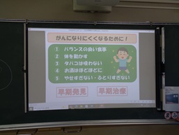 今日は6年生の『保健』授業で、生活習慣病とガンについて学習しました。いつもいつもスナック菓子や甘い飲み物ばかり摂取していると血管に脂肪がついて、血液が流れにくくなることや、早期にガンが発見できれば治りやすくなっていること等について学びました。将来の自分に健康アドバイスをするといったことも・・・