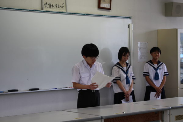 矢崎校長先生からは、「夏休み中の県総体やコンクール、学年発表に向けた取り組み、自習室(MUKAWAマナベース)での学習をとてもよく頑張っていた」、「2学期は合唱を中心とした武川中の良さをぜひ学校外に向けて発信して欲しい」、という話がありました。