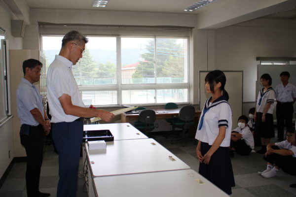 始業式のあとは、賞状伝達があり、県吹奏楽コンクールでの頑張りを全校で称え合いました。