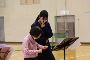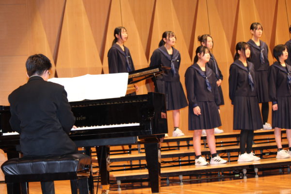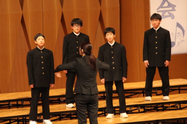 初めての音楽発表会に臨んだ1年生。2部合唱の「HEIWAの鐘」、そして3部合唱の「大切なもの」に挑戦しました。人数が少ないため、指揮者・伴奏者は先生方にお願いし、生徒みんなで声を出し合い、一つのハーモニーを作り出しました。歌詞の意味を丁寧に読み解き、気持ちを一つにすることで。8分音符が連続するような難しい箇所も、上手に乗り越えてきました。これからの成長が楽しみです♪