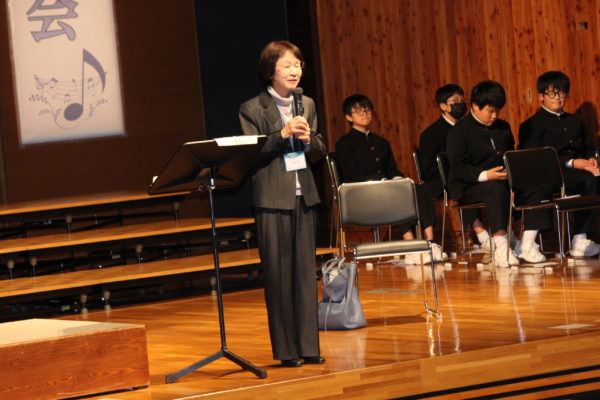 今年度も武川地域で合唱活動を行っている「チェリーブロッサム」のみなさんが合唱を披露してくださいました。特に、宮沢賢治作の有名な「雨ニモ負ケズ」にメロディーをつけた合唱では、手話も交えながら表現しており、息をするのも忘れるくらい真剣に聞き入ってしまいました。熟成された声と幾重にも重なる声のハーモニーは、生徒たちの良き手本となりました。チェリーブロッサムの皆さんの発表を聞き、「武川中の合唱の伝統は、学校だけではなく地域ぐるみで作られてきたのだ」と感じさせてもらいました。