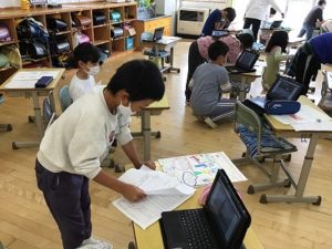 社会科の学習で警察の仕事のポスターを作りました。発表をするにあたり、タブレットでポスターの説明をビデオ撮影するか紙に説明を書くか自分で選びました。子ども達は,友だちのポスターをタブレットで見たり紙の説明を読んだりと自分で選んで見ていました。