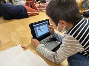 物語の絵を描くためにタブレットを使ってイメージを作りました。登場人物を最初に描きました。子ども達は「こんな感じかな」と話しながら描いていました。最後は,物語を読んで自分の印象に残った場面を描きました。タブレットに描くと消したり描いたりが簡単にできるので,子ども達も楽しく描くことができたようでした。