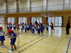 写真では、一列に並んで手を繋いだまま、フラフープを隣の子に渡していきます。友だちと息を合わせながら取り組む事ができました。