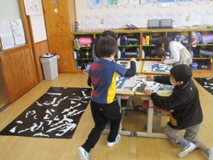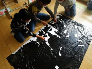 白い紙をはさみで自由に切り,切ったものを黒や紺の紙に貼る授業を行いました。子どもたちは直線で切ったり曲線を混ぜて切ってみたりと,色々な形を切っていました。切った紙を班で持ち寄って,「○○みたい」「○○に似ている」と想像を膨らませながら作品を作っていました。