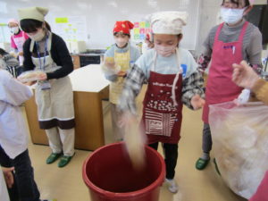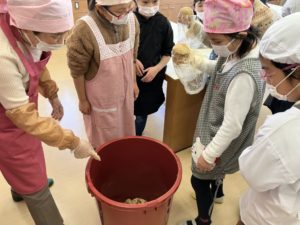 子どもたちは,糀の匂いを嗅ぐと「パンの焼く前の匂いだ。」「麦の匂いがするよ。」と話していました。
