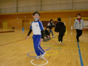 コースは台の上を歩き,ケンケンパでわっかを通り,縄跳びで自分の好きな技を3回跳んで,折り返し地点で待つ先生と体じゃんけんをします。