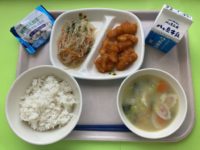 ピビンパ(麦ごはん・肉卵そぼろ・ナムル)・わかめスープ・いちごゼリー・牛乳