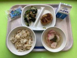 たけのこごはん・かつおカツ・わかめサラダ・花麩入りすまし汁・柏餅・牛乳