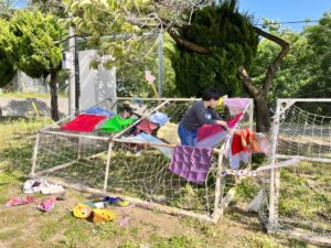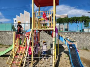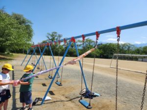 2023年5月16日 / 最終更新日時 : 2023年5月16日 長坂小 3年生 3年生 図工「布をつないで」 図工の学習でいろいろな形,大きさの布をつないで大きな作品を作りました。布と布を結んだり,クリップで止めたりして屋根やこいのぼり,ハンモックが完成しました。快晴の中,楽しい学習でした。