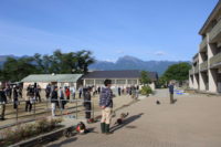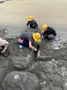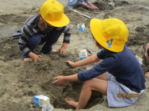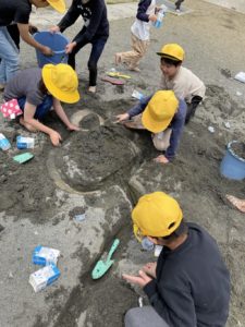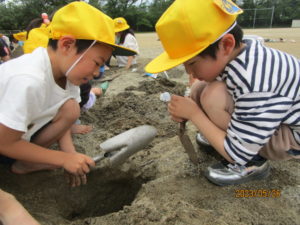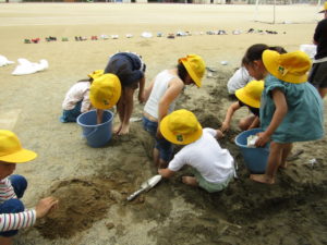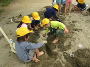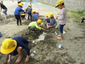 「すなやつちとなかよし」という学習は雨で延びていましたが、やっと行うことができました。子供たちは砂場に水をまき、その感触を楽しみ、いろいろ想像しながら作り始めました。足湯やトンネルを作ってダイナミックに遊ぶ姿が見られました。大喜びでした。