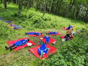 今回は、動植物の観察だけでなく、学校林にシートを敷いて、森林の空気や音に浸る時間も設けていただきました。中には、あまりの気持ちよさにウトウトしてくる人も‥。