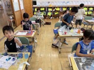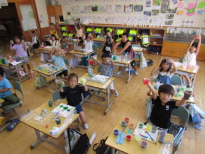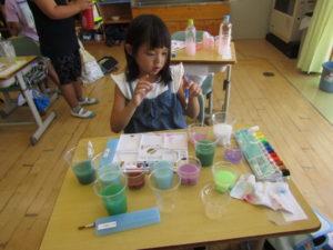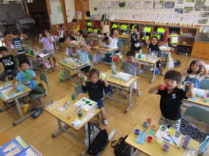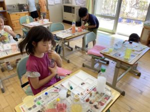 図工では、絵の具の色を混ぜて色水作りをしました。水に絵の具を入れて混ぜるときれいな色に水が変わり、子供たちも大喜びです。できた色水にほかの色を混ぜると、一瞬で違う色に変わり、またまた歓声があがりました。いろみずやさんを開いてお客さんをよんでいる子もいました。作った色水を持ち帰った子もいます。素敵ないろみずがいっぱいできました。