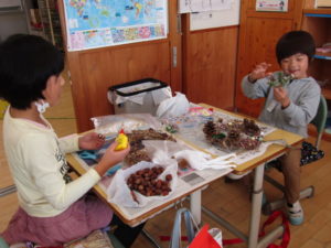 以前作ったあさがおのリースに飾り付けをしました。校外学習で拾った木の実をつけたり、お家から持ってきた飾りをつけたりしました。ボンドやグルーガンを上手に使い、思い思いにつけていました。かわいいリースができました。リースにつける飾りを準備していただき、ありがとうございました。リースは金曜日に持ち帰ります。