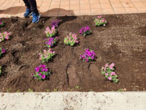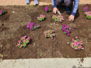㈱ミヨシ様から贈っていただいたペチュニアを職員室前の花壇に植えました。ミヨシ様からは、毎年きれいな花を贈っていただいています。ありがとうございます!