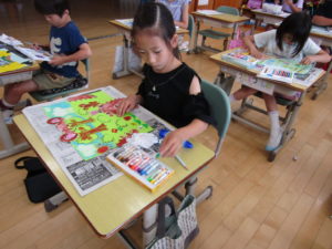 図工の学習で、「ふしぎなたまご」をしました。これは、たまごを想像して、さらにそのたまごからどんなものが生まれるのかを想像して絵を描く学習です。絵の中でのたまごは、楕円形だけでなく、もっと細長くなったり、雲のような形になったり様々な形になりました。また、そこから生き物だけでなく、ロケットや花火、植物、食べ物などたくさんの物も生まれてきました。子どもたちのアイデアは、無限大です。とてもカラフルな絵ができました。