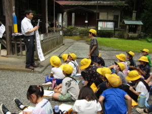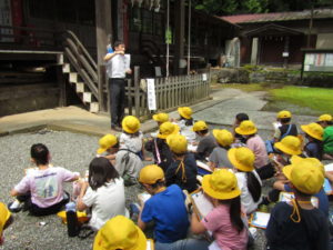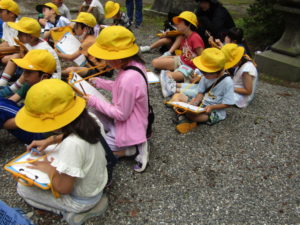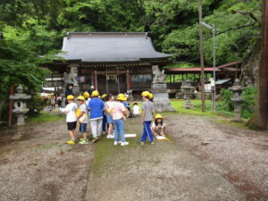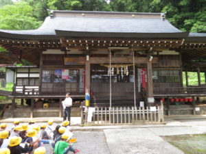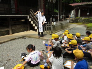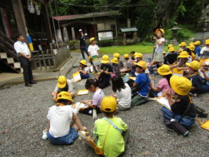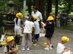 2年生の校外学習では、上条方面に歩いて出かけました。目的地は、穂見諏訪十五所神社です。氏子総代長の小尾宗彦先生に神社の歴史や、行事などについて教えていただきました。学校の近くの神社なので、「行ったことはある」「お祭りに参加している」と言っていた子も多かったです。しかし、いろいろと話を聞いてみると、知らないことがたくさんありました。神社境内の涼しげな雰囲気の中で、たくさん学ぶことができた校外学習になりました。
