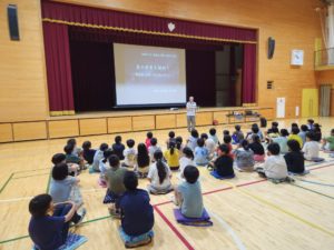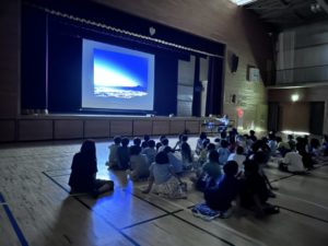 今日は牛山様を講師としてお招きして,『夏の夜空を訪ねて』というテーマで星の学習をしていただきました。真っ暗な体育館に牛山先生が撮影された夜空の星や月,たくさんの風景が映し出され,子どもたちは感嘆の声をあげていました。夏の夜空を旅した、そんな気分になりました。夏の星座,宇宙の浪漫をたくさん教えていただいたので,夏休みはみんな空を眺める時間が増えることでしょう。とっても素敵な時間になりました。ありがとうございました。
