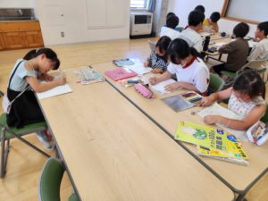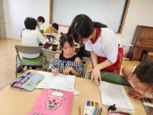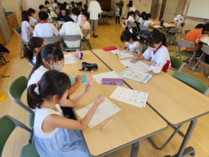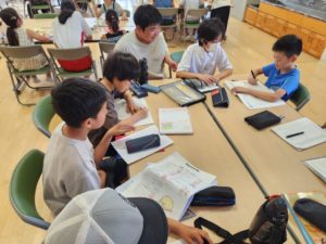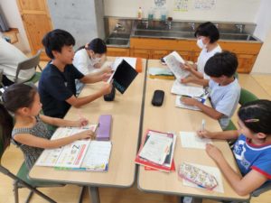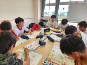 9時から11時までの2時間に渡り、夏休みの宿題を進める子、自由課題に取り組む子、中学生とのお話に花を咲かせる子(ーー)など、様々でしたが、小学生と中学生が楽しそうに学習に取り組む姿は、昨日同様よいものでした。