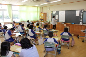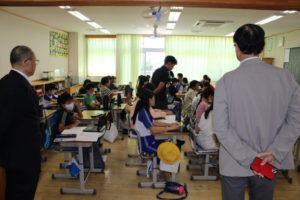 本校が県の少人数教育の対象になっているということから、学級の雰囲気や授業の様子を中心に視察が行われました。少人数教育の対象になっている2~4年生の様子をご覧になり、教室のスペースにゆとりがあること、先生の目が行き届きやすいことなどを実感されたようでした。
