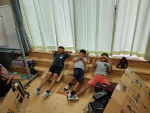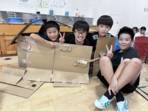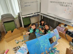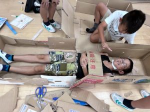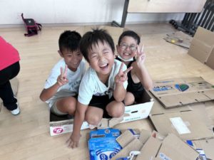 段ボールを組んだり、積み上げたりしながら、3階の多目的室に夢のまちを作り上げました。