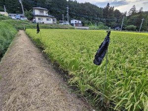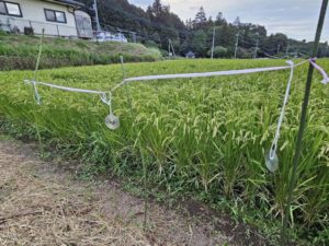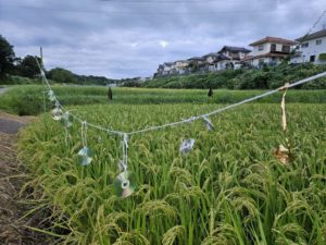 稲穂が実ってきたということで,子どもたちお手製のスズメ除けを設置!