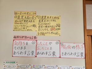 話し方や聞き方に関するポイントを示し、学習活動におけるヒントとして活用できるようにしている様子―。