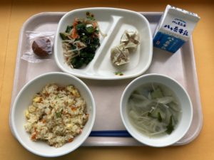 チャーハン・シュウマイ・ナムル・鶏ごぼうスープ・あんドーナツ・牛乳